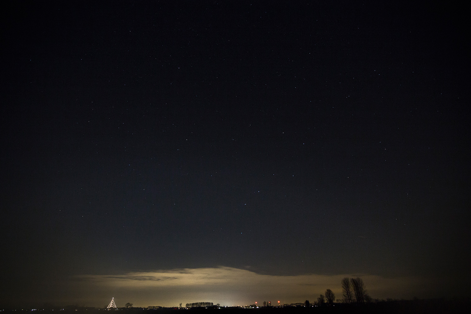 De voorspellingen waren goed, het zou een koude nacht worden met minimale bewolking. Dus dik aankleden met dikke trui, dikke sokken, oorwarmers en wanten. De opstelling om sterren te fotograferen bestaat inmiddels uit: laptop, usb-kabel, usb-verlengkabels, statief, verrekijker en camera. Voor je dan goed en wel buiten staat ben je wel even bezig. De ontsteltenis was dan ook groot als je eindelijk buiten bent, omhoog kijkt en je ziet alleen wat doffe sterren en een dik wolkendek! Wat een pech. Sta je daar om 23:30 uur met je hele set.