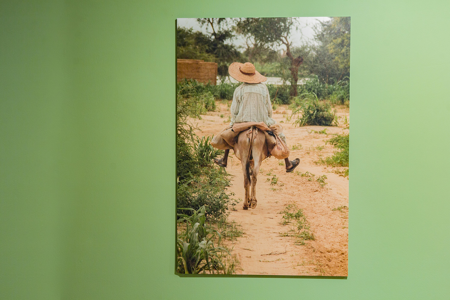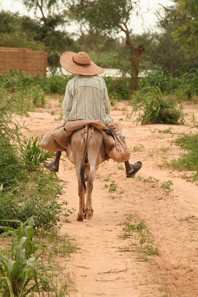 De man op de ezel is op donderdag vanaf de markt onderweg naar huis. Wat zou hij in die tassen bij zich hebben? Gekochte (etens)waren? Of wat hij over heeft na de marktdag in Zinder? Hij draagt typische Afrikaanse slippers die in Niger veel gedragen worden. Zijn blouse ziet er smoezelig uit. De hoed op zijn hoofd verraad dat hij behoord tot het Fulani volk, één van de ongeveer 13 volken die in Niger wonen. Het gewas op de naast het pad gelegen akker wijst erop dat het eind juli/begin augustus moet zijn. De acacia’s in de verte zijn al enkele tientallen jaren oud. De Fulani-man is bijna de stad uit. Nog één ommuurde tuin passeren, langs het seizoensmeer en dan door de velden verder zijn weg vervolgen…