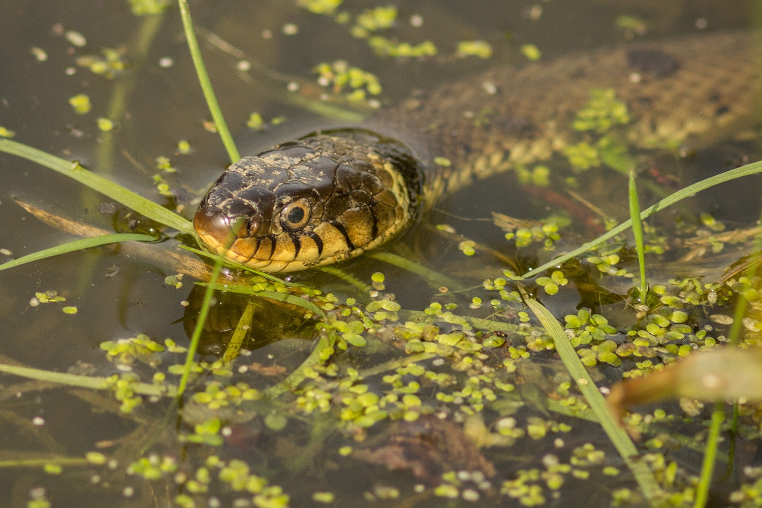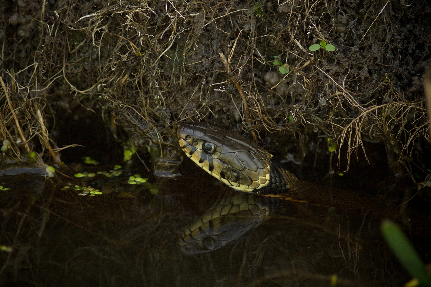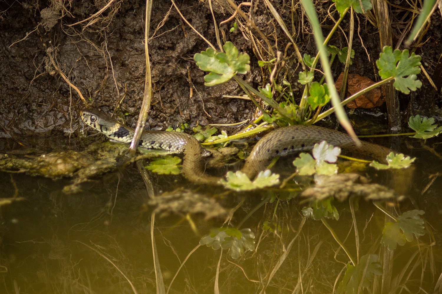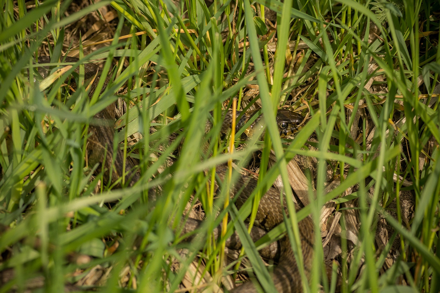 En toen – tussen het natte gras en druppelende dennen – vonden we een slangenhuid. Dat gaf ons nieuwe energie om door te zoeken. En jawel: even later spotten we een juveniele ringslang! Het kleine beestje had duidelijk een sterke wil om met rust gelaten te worden, want hij beet flink van zich af. Een uitgebreide fotosessie zat er dus niet in, maar: missie geslaagd – we hadden een slang!