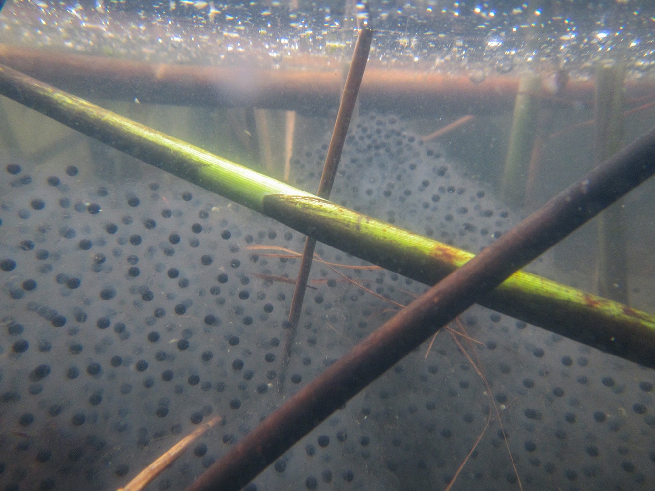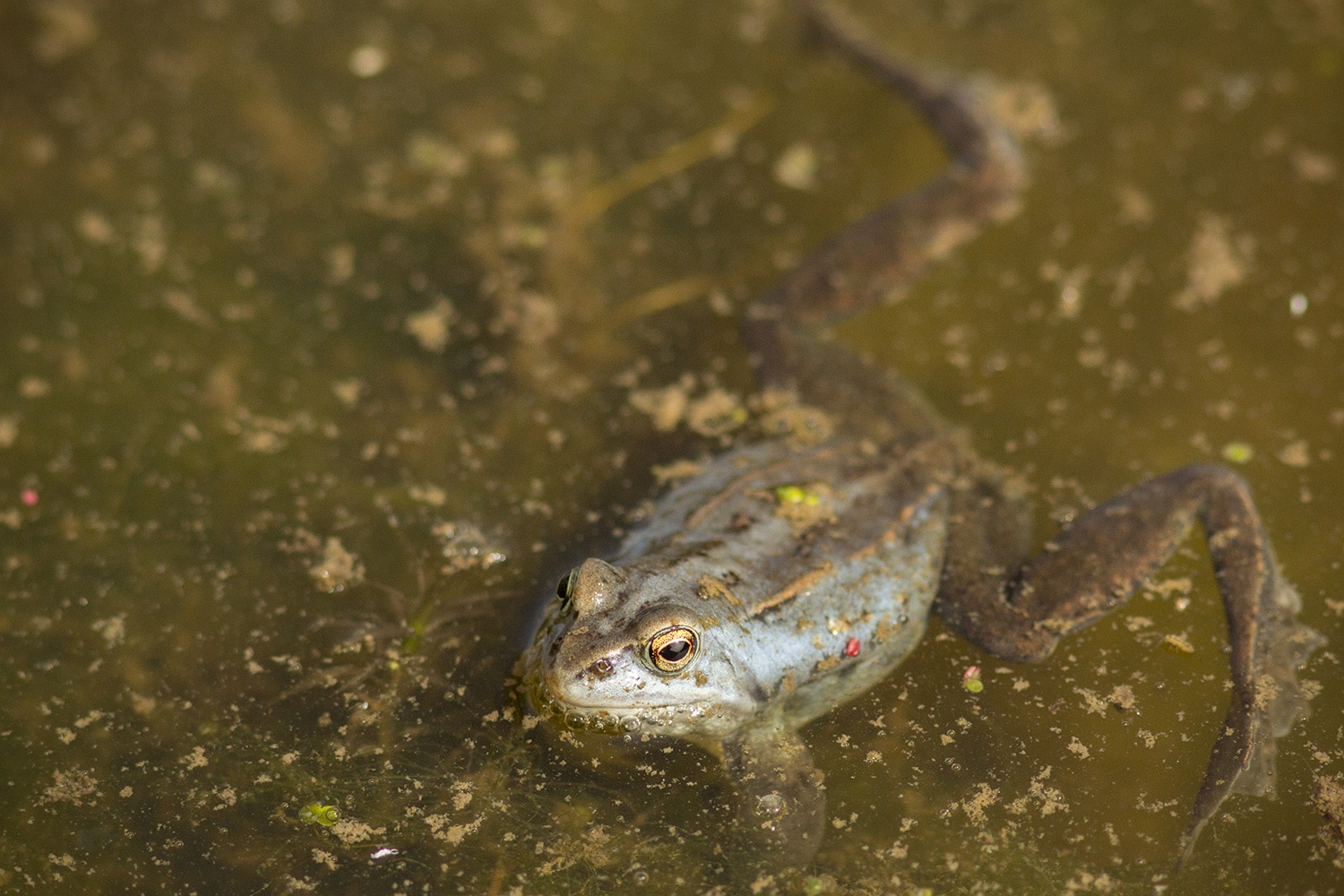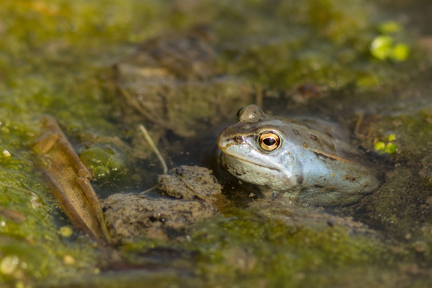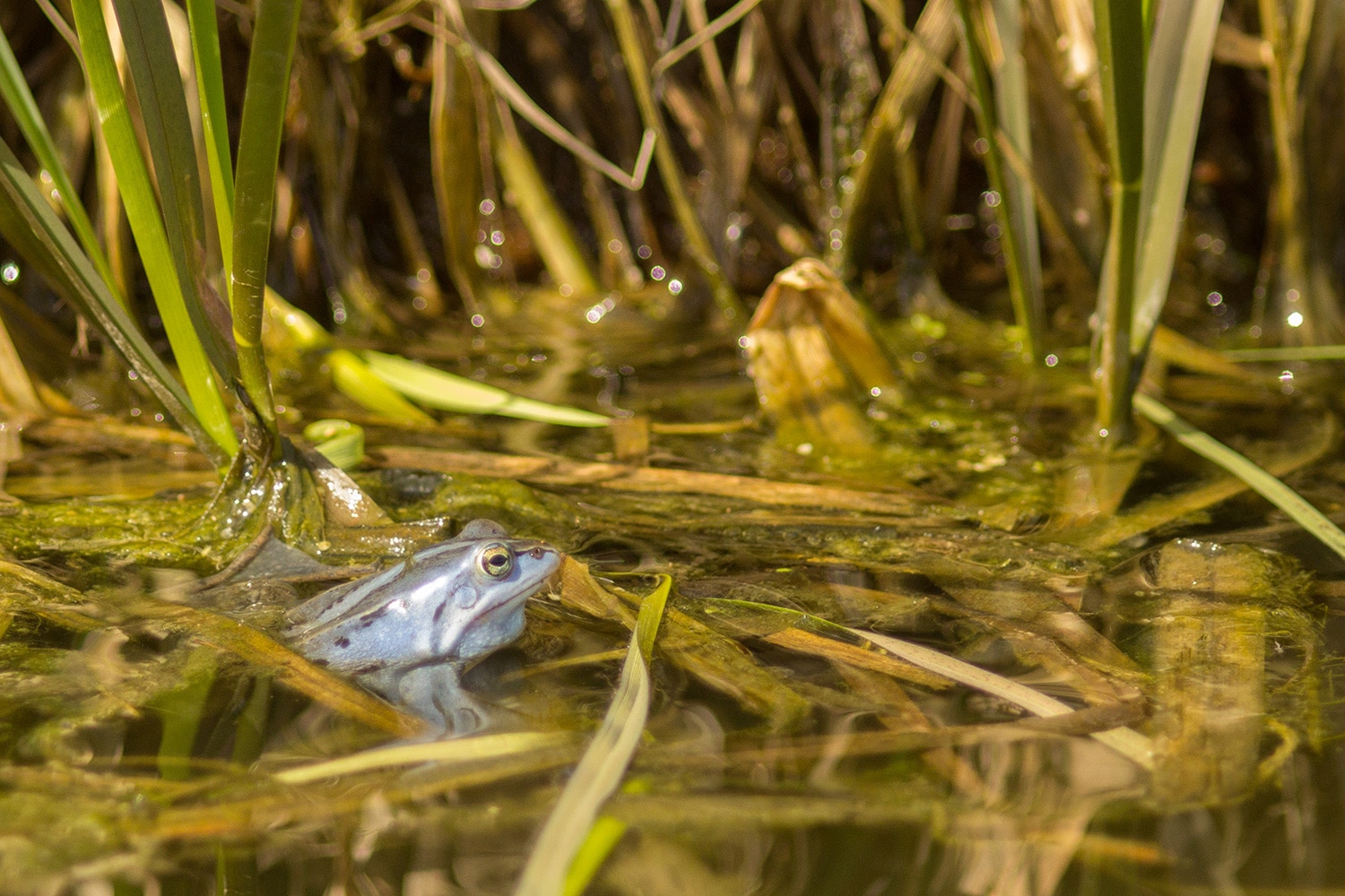 En toen – tussen het natte gras en druppelende dennen – vonden we een slangenhuid. Dat gaf ons nieuwe energie om door te zoeken. En jawel: even later spotten we een juveniele ringslang! Het kleine beestje had duidelijk een sterke wil om met rust gelaten te worden, want hij beet flink van zich af. Een uitgebreide fotosessie zat er dus niet in, maar: missie geslaagd – we hadden een slang!